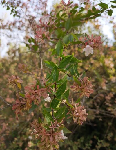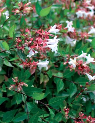 ES UN ARBUSTO SEMICADUCO, QUE PUEDE ALCANZAR LOS 2 METROS DE ALTURAS FÁCILMENTE, SU FLOR ES BLANCA CON UN CÁLIDO ROSADO. DA FORMA REDONDEADA, LA ABELIA QUEDARÁ BONITA, TANTO AISLADA EN UN JARDÍN COMO EN UNA JARDINERA. ES IDEAL PARA COMBINARLA CON OTRAS PLANTAS FORMANDO MACIZOS. ES DE CRECIMIENTO RÁPIDO, ES MUY RESISTENTE A LAS HELADAS, LE GUSTA EL SOL, ES RESISTENTE A LA SEQUÍA Y SOPORTA CUALQUIER TERRENO.