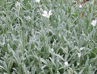 CERASTIUM TOMENTOSUM PLANTA PERENNE DE FLOR BLANCA, QUE FLORECE EN PRIMAVERA-VERANO, DE RÁPIDO CRECIMIENTO, ES IDEAL PARA CUBRIR TERRENOS SECOS, ARENOSOS Y ROCOSOS, ES DE TODO SOL, SU NECESIDAD HÍDRICA ES BAJA, NECESITA SUELOS BIEN DRENADOS.