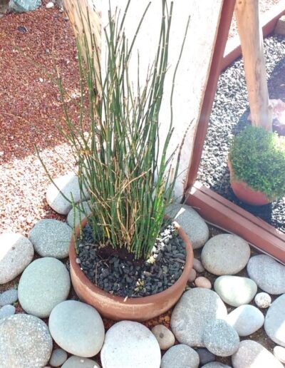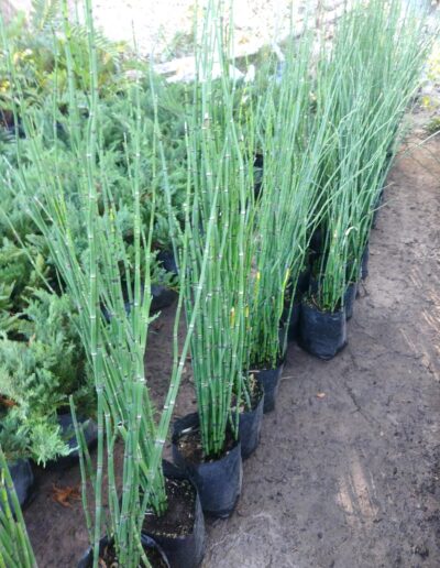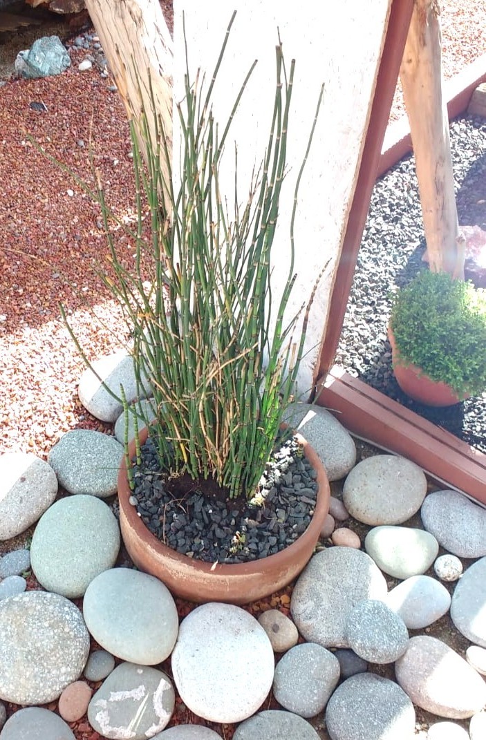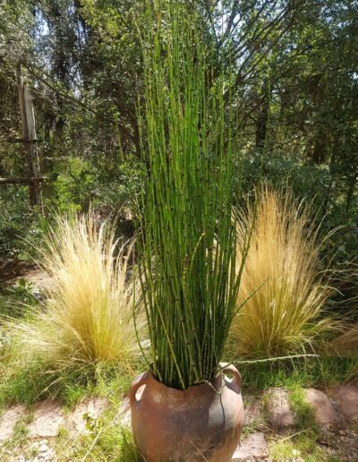 EQUISETUM – EQUISETUM HYEMALE ES ORIGINARIA DE EUROPA, ASIA, AMÉRICA DEL NORTE. SON IDEALES PARA PLANTAR EN JARDINERAS, MACETEROS, JARRONES, ESTANQUES, EN MACIZOS, ETC. ESTÁ FORMADO DE LARGOS Y DELGADOS TALLOS PERENNE HUECOS DE COLOR VERDE OSCURO, QUE PUEDEN LLEGAR A MEDIR 1.50M APROX. SUS HOJAS PEQUEÑAS QUE CRECEN UNIDAS AL TALLO FORMANDO UNA ESPECIE DE ANILLO DE COLOR NEGRO. NO PRODUCE FLORES NI SEMILLAS. SU NECESIDAD HÍDRICA ES ALTA, SU CRECIMIENTO ES RÁPIDO Y EXPOSICIÓN PUEDE SER SOL O SEMI SOMBRA, TAMBIÉN SE PUEDEN CULTIVAR BIEN EN INTERIORES. SE EXTIENDEN Y PROPAGAN FÁCILMENTE, POR LO QUE HAY QUE TENER UN POCO DE CUIDADO PARA QUE NO RESULTEN INVASIVAS.