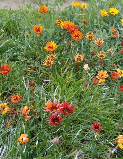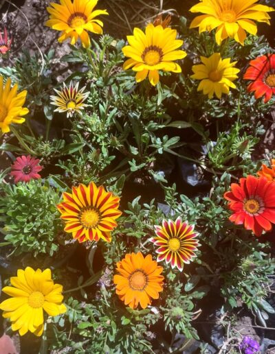 GAZANIAS – GAZANIAS SP. PLANTAS HERBÁCEAS PERENNES CON FLORES BRILLANTES Y LLAMATIVAS, QUE SE UTILIZAN AMPLIAMENTE COMO PLANTAS ORNAMENTALES. EN MACIZOS, BORDES, JARDINERAS. SON NATIVAS DE SUDÁFRICA Y SE CARACTERIZAN POR SUS FLORES SIMILARES A LAS MARGARITAS, EN COLORES COMO AMARILLO, NARANJA, ROJO, ROSA Y BLANCO Y FLORECEN EN PRIMAVERA-VERANO. SON RESISTENTES A LA SEQUÍA Y AL CALOR, LO QUE LAS CONVIERTE EN UNA BUENA OPCIÓN PARA ZONAS CÁLIDAS Y SECAS, PUEDEN LLEGAR A MEDIR 0.20 M.
