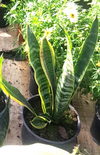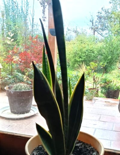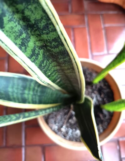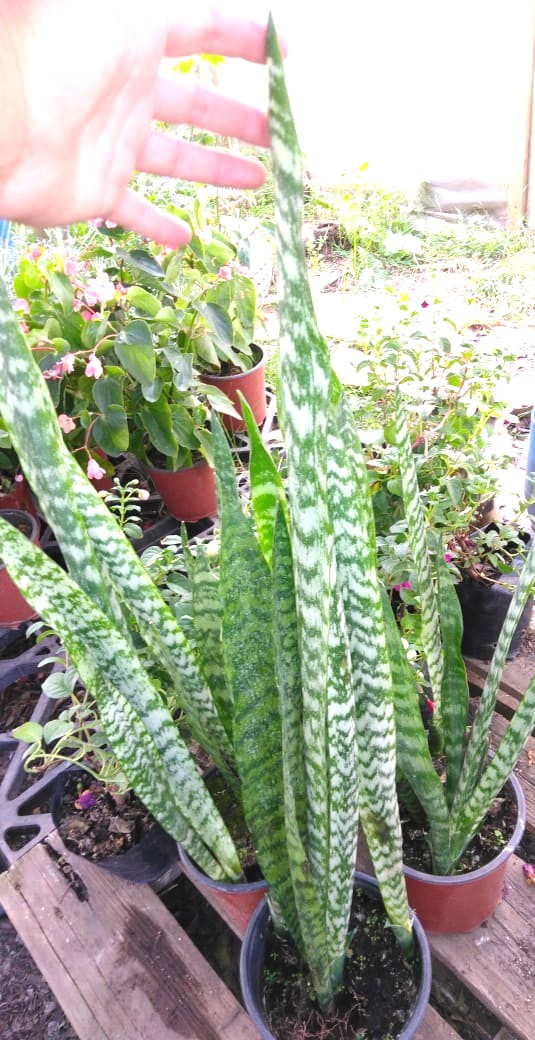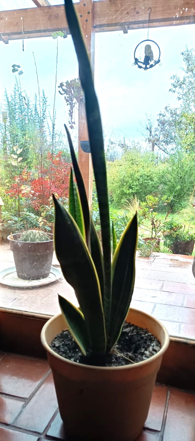 SANSEVIERIA – LENGUA DE SUEGRA ES UNA PLANTA PERENNE RIZOMATOSA DE HOJAS LARGAS Y RÍGIDAS, ERGUIDAS Y PUNTIAGUDAS, QUE PUEDE VARIAR EN COLOR Y PATRÓN. (VERDE OSCURO CON BANDAS TRANSVERSALES MÁS CLARAS, GRISÁCEAS, ETC.). ES UNA PLANTA MUY RESISTENTE Y LONGEVA, CAPAZ DE ADAPTARSE A DIFERENTES CONDICIONES DE LUZ Y TEMPERATURA. PUEDE ALCANZAR HASTA 1 METRO DE ALTURA. ES SENSIBLE AL FRÍO EXTREMO Y AL EXCESO DE RIEGO. ADEMÁS, SE HA DEMOSTRADO QUE PURIFICA EL AIRE, ELIMINANDO TOXINAS COMO EL FORMALDEHIDO Y EL BENCENO. SU USO PRINCIPALMENTE ORNAMENTAL, TANTO EN INTERIORES COMO EN EXTERIORES.