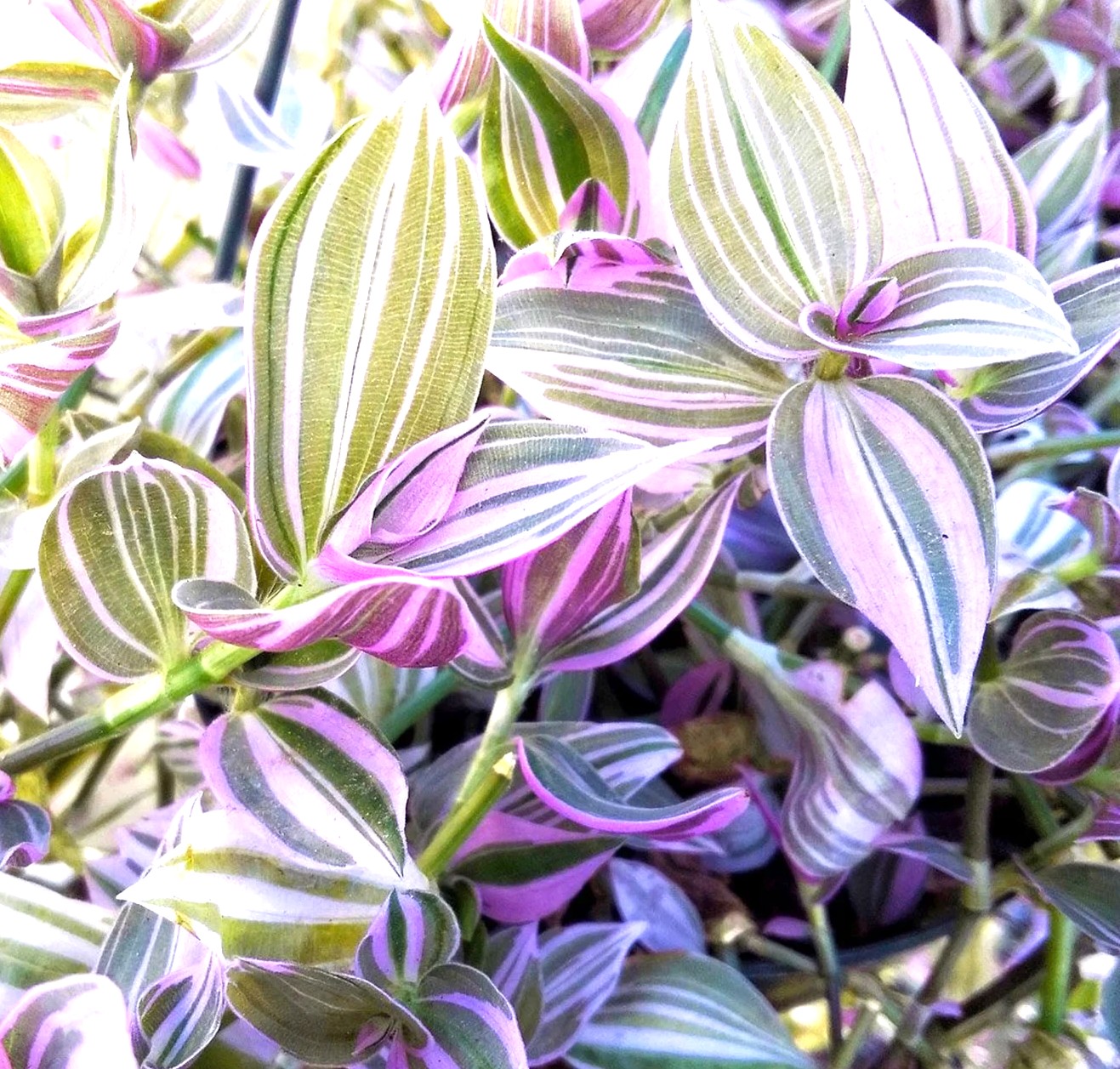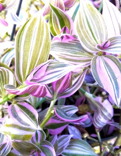 TRADESCANTIA ZEBRINA, PLANTA, HERBÁCEAS PERENNE DE HOJAS LARGAS Y OVALADAS, DE COLOR VERDE CON RAYAS PLATEADAS EN LA PARTE SUPERIOR Y PÚRPURA EN LA PARTE INFERIOR. SUS TALLOS RASTREROS Y SON COLGANTES Y PUEDEN EXTENDERSE CONSIDERABLEMENTE, LO QUE LA CONVIERTE EN UNA PLANTA IDEAL PARA COLGANTES O MACETAS. DE FLORES: PEQUEÑAS FLORES ROSAS O PÚRPURAS QUE APARECEN OCASIONALMENTE EN VERANO. NECESITA MUCHA LUZ, COMO EL SOL DE TARDE, PARA MANTENER SUS COLORES. NECESITA RIEGO MODERADO.